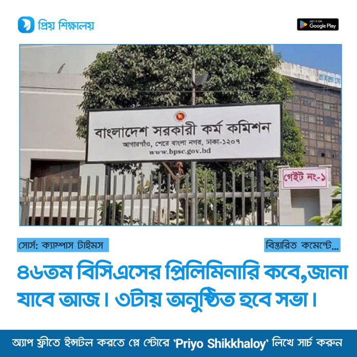 সূত্র জানায়, ৪৬তম বিসিএসের প্রিলিমিনারি পরীক্ষা আগামী ২০ এপ্রিল থেকে ২৬ এপ্রিলের মধ্যে আয়োজন করা হবে। প্রাথমিকভাবে এ বিষয়টি নির্ধারণ করা হয়েছে। পরীক্ষার তারিখ চূড়ান্ত করতে কমিশনের সভায় ডাকা হয়েছে।